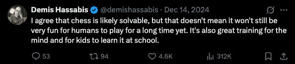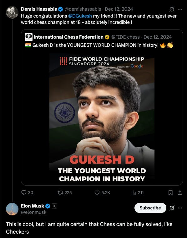 Speaking of people who are interested in these sorts of things, Demis Hassabis is a former chess prodigy. DeepMind, the company he founded, went on to create AlphaZero, a revolutionary chess AI that learned chess strategy purely by experimentation with no human input. He won the 2024 Nobel Prize in Chemistry for using AI to predict protein structures. Hassabis may be, quite literally, the most knowledgeable person in the world when it comes to the intersection of chess and AI. He’s well aware of the pablum that Elon is flinging at him.